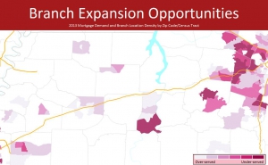 In addition to finding advertising opportunities, HMDA data can be turned into an insightful tool for uncovering new areas for future expansion plans. In this example, we have blended 2013 HMDA data and zip code business data to highlight high demand but under-served areas as represented by the darker shaded regions.